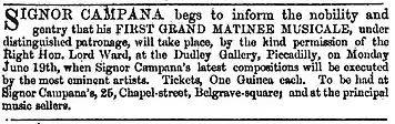 In 1850 Campana had gone to Paris, armed with a letter of recommendation from Rossini to seek a position at the Théâtre des Italiens which at that time was run by Benjamin Lumley.[1] He was unsuccessful, however, and returned to Italy. Then on the suggestion of Lord Ward, a principal benefactor of Her Majesty's Theatre, he went to London where he was to live for the rest of his life. There he opened a famous singing school, conducted concerts, and continued his reputation as a prolific and popular composer of art songs.[2] The first of his "Grand Matinee Musicale" concerts took place in 1854 under the patronage of Lord Ward, and featured his latest compositions. The 1860s saw the premieres of his last two operas. Almina premiered in London at Her Majesty's Theatre on 26 April 1860 conducted by Luigi Arditi with Marietta Piccolomini in the title role.[6] The critical reaction was tepid. The Musical World criticised its lack of "dramatic fire", but also went on to note that the audience did not appear to share that view: