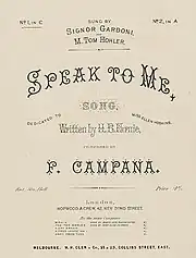 Campana composed at least two patriotic songs during the 1848–1849 Italian revolutions. One was set to Arcangelo Berettoni's poem "La costituente italiana" (The Italian Constituent).[13] The other, "Inno nazionale" (National Hymn) set to a text by Franco Carrai, became the most frequently sung song in Livorno at the time.[14] He also composed a chorus to accompany a dramatic allegory performed at the Teatro degli Avvalorati in 1847 to celebrate Leopold II, Grand Duke of Tuscany granting Livorno its own Civil Guard.[15] Between 1846 and 1854, Francesco Lucca, the firm which had commissioned Verdi's early opera Il corsaro,[16] published seven collections of Campana's songs. Ricordi was to publish another nineteen between 1851 and 1873. The Ricordi collections were variously entitled Souvenirs, Pensieri, Echi, Sospiri, or Ricordi (Souvenirs, Thoughts, Echoes, Sighs, Memories), with each one devoted to a different place which had a personal significance in Campana's life, including Naples, Venice, Rome, Paris, Bagni di Lucca, and Lake Como.[2] The majority of Campana's songs were set to Italian texts, some written by the composer himself such as "Quando da te lontano!" (When I Am Far From You!). However, he also set texts by English writers which became popular both as concert pieces and as parlor songs. His most well-known collaborators in this genre were Henry Brougham Farnie (e.g. "Speak to Me" and "The Scout: A Trooper's Ditty") and Henry Hersee (e.g. "A Free Lance Am I: Or the Soldier of Fortune" and "The Little Gipsy").[17] Another popular concert piece in England was Campana's "Voga, voga, O marinaro" (Row, Row, O Sailor), a barcarole for three female voices. It was later mentioned in Eleanor Farjeon's 1941 novel, Miss Gransby's Secret, a satire on the sensibilities of the Victorian era.[18]