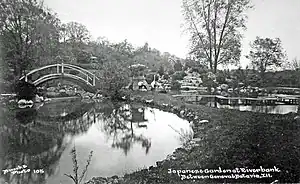 In 1910, the Fabyans hired Taro Otsuka to design a Japanese-style garden below the villa.[3] The one-acre garden was developed over the next several years, and from 1918 on, maintained by Susumu Kobayashi, a Japanese immigrant gardener. Japanese gardens were popular amongst the upper class, and it was a well-known attraction throughout the 1920s and 1930s. Although neglected for decades after the Fabyans, the Fabyan Japanese Garden was renovated beginning in 1974, and today contains restored and replicated original elements including a pond, waterfall, moon bridge, oversized lantern, and teahouse.
