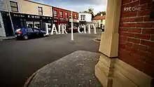 Fair City is set in Carrigstown, a fictional suburb of the Northside part of the city of Dublin. "Carrick" is found in many real Irish locations (for instance: Carrickmacross, Carrickfergus, Carrick-on-Shannon, Carrick-on-Suir), and is derived from the Irish-language word carraig, meaning "rock".[8] Many of the scenes take place around the main street in Carrigstown, with notable landmarks on the street including McCoy's pub, Phelan's corner shop (now Spar, formerly Doyle's), The Hungry Pig (formerly The Bistro), the Community Centre (formerly The Haven) and Vino's (formerly Rainbows Sandwich Bar). Other recurring settings include the Acorn Cabs dispatch centre, the shared office, the Helping Hand charity shop, the surgery and most recently the Peggy Tea coffee shop.[9]