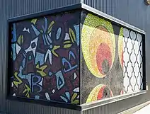 The station's feature wall consists of glass tiles in a pattern of white, black, blue, and gray.