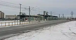 Fairway is a light rail station and bus station in Kitchener, Ontario, Canada. It is a stop on the Region of Waterloo's Ion rapid transit system.[1] The station is located just off Wilson Avenue between Fairway Road and Kingsway Drive, adjacent to the Fairview Park Mall. Fairway is the southern terminus of the Ion light rail line, with adapted bus rapid transit (the 302 Ion Bus) continuing on toward Cambridge. The station opened on June 21, 2019. At the same time as the light rail launch, the existing bus terminal was moved from its current location adjacent to the Hudson's Bay store, to a new park and ride lot at the corner of Fairway and Wilson, off of the mall property.