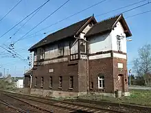 The former signal box W 12 at Übigau station is on the list of historic monuments of the town of Uebigau-Wahrenbrück. It is located directly next to the platforms of Uebigau station, the entrance building of which is also a listed building.[20]