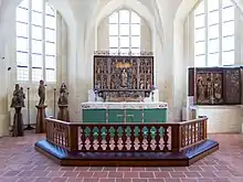 The church contains some noteworthy interior details. The sculpted baptismal font is the earliest piece in the church, dating from the 14th century. The main altar is from the second half of the 15th century and probably made by Hermen Rode of Lübeck, or in his atelier. A smaller side-altar is from the same time period and likewise from northern Germany. There is also a sculpture depicting Saint Christopher made circa 1390, and attributed to Master Bertram of Minden. Two free-standing medieval Madonnas, one reputedly of French origin, can also be mentioned, as can a sculpture depicting a kneeling princess - the only remnant of a Saint George and the Dragon group, supposedly by master carver Henning Roleve of Rostock, another northern German late Gothic sculptor. [1][2]
