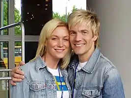Fame was a Swedish musical duo consisting of Jessica Andersson (born 27 October 1973 in Stockholm) and Magnus Bäcklund (born 16 November 1965 in Kristinehamn, Värmland County). They met each other at the televised arts school and contest Fame Factory, which aired in autumn 2002. Bäcklund was the overall winner, while Andersson dropped out to give birth to her son Liam. Bäcklund also has two young twin daughters at home. Andersson is a former photo model and Bäcklund is a commercial pilot.