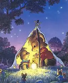 Knowing where Periwinkle possibly could be, Papa searches for him and eventually comes across the tent. Inside, he reminds his son that no one lives at the old Bellflower home any more. But, when Papa tells him of a housewarming at their new place, Periwinkle cheers up, and the two of them head back over the hill to join in the fun.