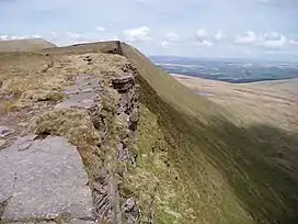 Fan Hir is a peak at the eastern end of the Black Mountain (Y Mynydd Du) in the Brecon Beacons National Park (Parc Cenedlaethol Bannau Brycheiniog) in southern Wales. It is a subsidiary summit of Fan Brycheiniog. It falls within the county of Powys and is also a part of the traditional area of Fforest Fawr. Its Welsh name means "long peak", a fitting description, particularly if seen from the east when its steep eastern face is seen to advantage. It is about 2.5 miles or 4 km long and faces east. Its summit is 2490 feet (about 760m) above sea level. Fan Hir is separated from its higher neighbour to the north-west, Fan Brycheiniog (2633 feet or 802 metres) by a col known as Bwlch Giedd, where a path rises from Llyn y Fan Fawr via a stone staircase.[1]