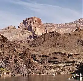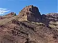 Fan Island is a 5,092-foot-elevation (1,552-meter) summit located in the Grand Canyon, in Coconino County of northern Arizona, US.[3] It is situated two miles south of Dutton Point, 2.5 miles west-northwest of Dox Castle, and 1.6 miles south-southwest of Masonic Temple. Topographic relief is significant as it rises 2,900 feet (880 meters) above the Colorado River in one mile (1.6 km). Fan Island was so named because the flat top resembles an unfolded hand fan.[5] According to the Köppen climate classification system, Fan Island is located in a cold semi-arid climate zone, with precipitation runoff draining south to the Colorado River via Hakatai Canyon from the west aspect, and Burro Canyon from the east aspect.[6] This butte is an erosional remnant composed of Redwall Limestone overlaying the Tonto Group.[7]