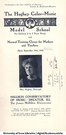 Fannie E. McKinney Hughey conducted The Hughey Color-Music Model School for children from two to seven years of age, and normal training classes for mothers and teachers at the Milliken Conservatory of Music, Decatur, Illinois. Along with the musical training went instruction in number work, nature work, bodily exercise, and for the more advanced pupils languages were taught. The training school was for those who wish to learn the Hughey system, either for teaching or for home instruction. [1] [2]