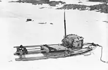On the evening of 13 December Mawson and Mertz rearranged the sledges. The rear-most sledge, which had carried the most weight, was well-worn, and they decided to abandon it. The remaining supplies were re-distributed between the remaining two sledges. Most of the important supplies—the tent and most of the food—were stored on the new rear sledge;[47] if they were to lose a sledge down a crevasse, they reasoned, it would be the front, less-vital sledge.[48] As the rear sledge was heavier, the strongest of remaining dogs were assigned to pull it.[47] At the camp they left a small amount of supplies, including the abandoned sledge and a tent cover, without the floor or poles.[49]