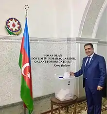 He was a candidate in the Azerbaijani presidential elections in 2013 and 2018.[2] He stated that Turkish films do not need to be voiced.[3] Deputy Ferec Guliyev suggested that "Azerbaijani soldiers should fight against the terrorist organization PKK together with the Turkish army".[4] Ferec Guliyev expressed some of the issues that have been discussed and desired in the Turkish World for many years and stated that "Turkish World relations should be transferred to the political and military field".[5]