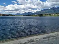 The lake is about 75 hectare, larger than the Artificial Lake of Tirana.[1] It has a maximum length of two kilometers as well as a maximum width of 700 meters. The dam at the south is about 300 metres long.