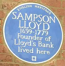 The former 56-acre "Owen's Farm"[3] with an Elizabethan farmhouse[4] in the manor of Bordesley,[5] now in the locality of Sparkbrook, was purchased in 1742 by Sampson II Lloyd (1699–1779) of nearby Edgbaston Street, Birmingham, an iron-master who later in 1765 co-founded Lloyds Bank. He was descended from the ancient family of Lloyd of Dolobran Hall in Montgomeryshire (now Powys) in Wales. He retained the Tudor farmhouse and built near it "Farm" an eponymous mansion house, which survives as a grade II* listed building known today as "Lloyd's Farmhouse, Farm Park, 139 Sampson Road, Birmingham", one of the most important of the rare surviving Georgian buildings in the city of Birmingham.[6][7] An English Heritage blue plaque is affixed to the building.