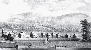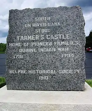 Farmer's Castle was a defensive fortification built opposite the mouth of the Little Kanawha River on the Ohio River by a group of pioneers from the Ohio Company of Associates. It was located about 15 miles downriver of Marietta, Ohio, the first European-American settlement in the Northwest Territory. The pioneers had surveyed the land during the winter of 1788-89, and moved from Marietta to their new farms in April 1789. They called their town Belle-prairie, or modern day Belpre, Ohio. Adjacent to the island later known as Blennerhasset Island, the settlers began construction of Farmer's Castle during January 1791 for protection during the Northwest Indian War.