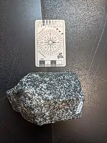 The Farmington Gabbro is postmetamorphic medium to coarse grained plutonic rock next to metagabbros.[2] The unit is surrounded by Proterozoic to early Paleozoic metamorphosed rock.[1] The major and trace elements of the pluton matches the composition of calc-alkaline basaltic magma.[2] The minerals present are plagioclase, hornblende, pyroxenes, olivine, biotite with small amounts of apatite, magnetite, ilmenite, hematite, pyrite, pyrrhotite, and hercynitic spinel.[4][2] The main texture in the gabbro is ophitic to sub-ophitic, but hornblende and plagioclase are subhedral to anhedral grains.[2] Plagioclase is twinned with little zoning.[2] The pyroxene content is mostly clinopyroxene with some orthopyroxene.[2]