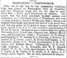Greig's reward was to be chosen for the London representative side in the match against the Sheffield Football Association representative side, albeit not as a goalkeeper.[6] However there are no further fixtures recorded for Farningham, which had been struggling in previous matches to put out a full side. On one occasion the club relied on a spectator to help fill out a 10 man side,[7] and two weeks before the Wanderers game the club only turned up with eight men for a match with South Norwood.[8]