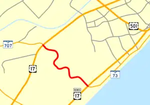The intersection of Farrow Parkway and South Carolina Highway 707 with U.S. Highway 17, known as the "back gate" of the former base, has seen increased traffic with the construction of The Market Common, expansion of the Myrtle Beach International Airport and other development on and near the former base.[5] One of the first priorities for Horry County's program 'Riding on a Penny' was to build a grade-separated interchange connecting the two roads together. The projected cost of the project was $49,500,000. The recommended configuration of the interchange, due to limiting right-of-way space and heavy traffic demands, is a single-point urban interchange.[6] Also, U.S. 17 must go over a 35-foot-high, 1,200-foot-long bridge because the soil cannot support a stronger bridge without work that would have delayed the project.[7] As of April 2010, the projected cost had more than doubled to $107 million.[8] Interchange construction began June 6, 2011, and the projected completion date was August 2014.[9] Soil conditions and weather caused many delays. On October 23, 2014, a ribbon cutting took place for the completion of what became a $121.7 million project. The southbound lanes opened earlier that week, and the northbound lanes were opening the next week. Pavement markings, signs and other details would not be complete until November. The project also included more turn lanes on U.S. 17, frontage roads, and the addition of Coventry Boulevard as an alternate route around the interchange.[5]