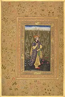 Around 1609, Beg returned to the Mughal Court, now under the rule of Emperor Jahangir. His return is dated by a mention in Jahangir's memoirs, which report Jahangir bestowing 2,000 rupees on the "unrivaled" Farrukh Beg.[8] Under the auspices of Jahangir, Beg worked on the Gulshan Muraqqa, an album of illustrations assembled by Jahangir, as well as the Minto Album. He also painted several folios, now separated from their original work and dispersed among collections around the world.[4] The latest mention of Beg occurs in Iqbalnama-i Jahangiri, penned by Mutamad Khan, celebrating Beg's artistic ingenuity and creativity by referring to him as "who has no rival or equal in the space of the universe."[4]
