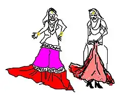 Farshi Pajama (also Paijama) (Urdu: فرشی پاجامہ, Hindi: फ़र्शी पजामा, Bengali: ফর্শি পায়জামা) is a woman's dress that was worn between early 20th centuries in Muslim courts of Oudh by royalty and ladies from privileged classes of Uttar Pradesh (formerly United Provinces of Agra and Oudh in North India). Modeled after the flowing gowns worn by British noblewomen,[1] the complete outfit consists of three basic parts – the kurta or a long shirt, the dupatta or the long stole (an essential piece in traditional Indian wear covering the head and chest), and the third and most important, the farshi pajama, which is a flowing two-legged skirt held by drawstrings. It falls straight to the ankles from where it starts flaring flowing copiously onto the floor. The farshi pajama in this era is often called Farshi Gharara, a term not used before the mid-20th century and is considered a distortion. The confusion is said to be because of the Farshi Pajama's similarity with the Gharara.