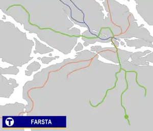 Farsta metro station is on the green line of the Stockholm metro, located in Farsta, Söderort. The station was inaugurated on 18 November 1958 when the one-station extension from Hökarängen was completed. A temporary station functioned until 4 November 1960, when the permanent station was opened. On 29 August 1971, the line was extended further to Farsta strand.[2] The distance to Slussen is 9.4 km (5.8 mi).