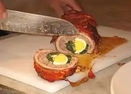 Farsu magru is prepared with beef or veal slices that are flattened and superimposed to form a large rectangle.[6] On top of this is a layer of thin bacon slices. For the filling, crushed bread slices, cubed cheese and ham, chopped onions, garlic and fresh herbs are mixed together.[1][7][6] Subsequently, the filling is evenly distributed, and hard boiled eggs are laid in the middle.[1] The meat is then rolled around the eggs, tied together and cooked in an oven.[1] The dish can also be cooked by poaching.[2][6] It is topped with tomato sauce or tomato purée.[1]