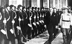 Fascism became influential in Bulgaria during the 1930s, when parliamentary democracy has failed.[24] In May 1934 Bulgarian coup d'état was carried out by the Zveno military organization, aided by the Bulgarian Army, which abolished political parties altogether. As result the small Bulgarian National Socialist Workers Party disappeared. However, in April 1935, the officers were replaced by Tsar Boris. Since then, the Tsar decided to take power into his own hands, while elections were held in 1939 on a nonpartisan basis. That was some kind of "royal dictatorship" similar to the one implemented by Alexander I of Yugoslavia between 1929 and 1931. In 1940, upon Bulgaria getting into the new war on the Axis side, the regime was institutionalized by creating a fascist-type mass youth movement called Brannik. Despite that organisation became numerically large, Bulgaria hadn't developed a corporate economic system essential to fascism nor any adult counterparts like trade unions or militias were created. Anti-Jewish propaganda gradually intensified in Bulgaria which led to the introduction of antisemitic law. Boris III feared the use of these organizations as a means of pressure from Germany and sought to limit their contacts with German officials.[25] Boris died in 1943 and was replaced by a regent council, while it was itself overthrown the next year, making the country now on side with the Allies.[26] In September 1944, the Zveno and the anti-Axis Fatherland Front engineered a new coup d'état. Curiously, while the fascist influence on the Zveno itself is undisputed, the ideology of that organization in its character was not fascist.[27] Thus, fascism proved considerably less successful in Bulgaria than in WWII Romania, Hungary, Croatia or Serbia.[28]