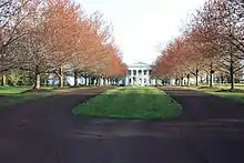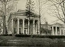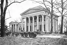 Possibly inspired by "Andalusia" (1834–36), Nicholas Biddle's great Greek Revival mansion overlooking the Delaware River, architect John Haviland designed a "western counterpart" for Dr. Wetherill, "Fatland Hall," overlooking the Schuylkill River.[22] The size and arrangement of the mansion's center hall and formal rooms were similar to James Vaux's expanded farmhouse,[9] but with much higher ceilings: "Fatland is special for the scale of the portico and its juxtaposed miniature service wing."[22] The overall composition was asymmetrical,[9] the first floor of the single wing (to the east) consisted of the formal dining room, and pantries and the family dining room in the end pavilion. The kitchen was in the basement below, and servant rooms were above.[9] The end pavilion featured painted-wood-columned porticoes on the front and rear facades.[9] The great Ionic columns of the main block's porticoes were of white marble.[9] The mansion was completed about 1845.[9] A stone tablet in its south gable reads: "J. Vaux, 1776; rebuilt by William Wetherill, 1843."[3]: 200 "Bayard Taylor, the historian and traveler, claimed [the view from the piazza] was the most beautiful view along the beautiful Schuylkill river."[19]: 1006