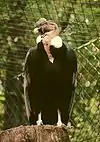The adult plumage is of a uniform black, with the exception of a frill of white feathers nearly surrounding the base of the neck and, especially in the male, large patches or bands of white on the wings which do not appear until the completion of the first molting.
