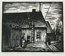 Cannery Buildings, 1936, b&w block print by Fay Chong.