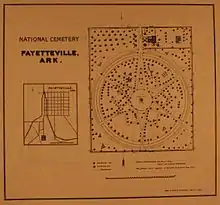 The original plot of 6 acres (2.4 ha) of land for the National Cemetery was purchased in 1867 from Judge David Walker and Stephen Stone,[3] names also associated with the historic Walker-Stone House in Fayetteville. The original layout was of an outer circle surrounding a six-pointed star with diamonds between the points of the star and a flagpole in the center. There were eighteen sections with an estimated capacity of 1,800 graves.[4] The first interments were remains moved from battlefield cemeteries of the Battle of Prairie Grove and the Battle of Pea Ridge. By 1871 there were 1,200 interments made in the cemetery, most of which were unidentified.