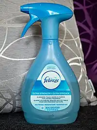 Febreze is an American brand of household odor eliminators manufactured by Procter & Gamble. It is sold in North America, South America, Europe, Africa, Asia, Australia, and New Zealand.