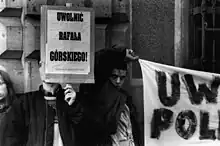 Anarchists from the FA took part in May Day demonstrations against Soviet Poland[26] and organized anti-tax rallies.[27] In the early 1990s in several Polish cities, FA protested against the introduction of religion to schools, and in front of the Sejm they led protests against the passing of the anti-abortion law.[28] In recent years, FA activists have been defending tenants as part of the campaign "Mieszkanie Prawem NIE Towarem" (Apartment [are a] Right, NOT a Commodity), by participating in eviction blockades.[29]
