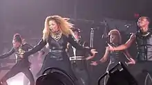 Jackson and her dancers performing "Feedback" during her Unbreakable Tour (2015–16).