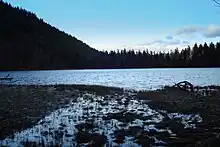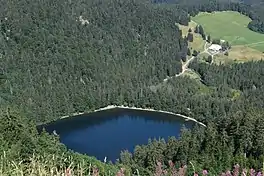 The Feldsee is a tarn, around 97,500 m2 in area and up to 32 metres deep. It was formed by glaciers of the last ice age.[1] The largest tarn in the Black Forest, it is hemmed in on three sides by steep mountainsides up to 300 metres high. It is almost circular and has a diameter of between 350 and 370 metres. This area of highland at a height of 1,100 m, which is open to the northeast, enabled it to amass and retain the huge quantities of snow that were the cause of this armchair-shaped terrain with its steep back face, level floor and embankment of moraine at the front. The lake formed after the melting of the ice sheet behind the lines of heaped-up glacial debris.[2] The Seebach stream, which rises between the Feldberg and Seebuck in the Grüble, flows through the Feldsee, tumbling over the Feldsee Waterfall on the wall of the cirque, eventually becoming the Gutach at the far side of the Titisee. For several hundred thousand years this was the upper course of the ancient Danube (Urdonau), which flowed into the present-day Danube near Immendingen and, for the last several ten thousand years has formed a headstream of the Wutach, which flows into the Rhine.