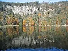 Currently there is a general ban on bathing in the Feldsee. This is in order to protect a rare underwater fern, the spiny quillwort (Isoetes echinospora), that thrives in water 1–2 metres deep and only occurs in Germany in the Feldsee and Lake Titisee.[3] This plant grows in lakes with cool, very clear water that are low in nutrients.[4] Around the Feldsee is a so-called Bannwald. This mixed forest is also protected and is allowed to grow naturally. It has been protected since 1937 and is the oldest nature reserve in Baden-Württemberg.[5] The Feldsee Crags (Feldseefelsen) are out of bounds to climbers. The Feldberg rangers enforce these rules strictly. There are rare plants here like the alpine sow-thistle, Turk's cap lily, wolfsbane and sundew.[6]