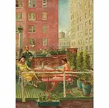 Over the course of her career Meyer came to be known best for her landscapes of the Vermont locale where she spent the summer months.[12] Her 1940 painting, "Vermont Hillside," (shown at left) is typical of these landscapes. She was also known for depictions of the New York locale where she spent the cooler months. Her painting, "Cocktails on the Terrace" (shown at right) is typical of these.[9] She was also known for her floral still lifes, such as the one shown at left[12] and figure studies, such as the self portrait shown at right.[19]