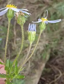 The flower heads sit individually on the clearly distinguished inflorescence stalks that are mostly richly glandular near the top. The bracts surrounding the head that jointly form the involucre of up to 8 mm (1⁄3 in) in diameter, are arranged in two whorls. The bracts of the inner whorl are Inverted lance-shaped, about 5 mm (0.20 in) long and 1 mm (0.039 in) wide, ribbed, and a little bristly. The outer bracts are lance-shaped, about 6 mm (0.24 in) long and 1 mm wide, with three sunken resin ducts, and consistent with the indumentum of the leaves, variously bristly hairy or also glandular. About twelve to fourteen female ray florets have a blue strap of ligula of about 11 mm (0.43 in) long and 1½ mm (0.06 in) wide, blue. These surround many bisexual, disc florets with a yellow corolla of about 4 mm (0.16 in) long. In the center of each corolla are five free filaments and five anthers merged into a tube, through which the style grows when the floret opens, hoovering up the pollen on its shaft. At the tip of both style branches is a triangular appendage. Around the base of the corolla is one whorl of vigorous, equally long, white, shortly toothed, but smooth at their base, largely persistent pappus bristles of about 4 mm (0.16 in) long. The eventually black, dry, one-seeded, indehiscent fruits called cypselae are inverted egg-shaped to elliptic, about 3 mm (0.12 in) long and 1½ mm (0.06 in) wide, have a ridge along the outline, are hairless or rarely have a few bristles near the top, and a further smooth seedskin.[2]