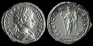 During the Republic, only divine personifications known to have had a temple or public altar were featured on coins, among them Felicitas.[47] On the only extant Republican coin type, Felicitas appears as a bust and wearing a diadem.[48]