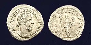 A calendar from Cumae records that a supplicatio was celebrated on April 16 for the Felicitas of the Empire, in honor of the day Augustus was first acclaimed imperator.[49] In extant Roman coinage, Felicitas appears with a caduceus only during the Imperial period.[50] The earliest known example is Felicitas Publica on a dupondius issued under Galba.[51] Felicitas Temporum ("Prosperity of the Times"), reflecting a Golden Age ideology, was among the innovative virtues that began to appear during the reigns of Trajan and Antoninus Pius.[52] Septimius Severus, whose reign followed the exceedingly brief tenure of Pertinax and unsatisfactory conditions under Commodus, used coinage to express his efforts toward restoring the Pax Romana, with themes such as Felicitas Temporum and Felicitas Saeculi, "Prosperity of the Age" (saeculum), prevalent in the years 200 to 202.[53] Some Imperial coins use these phrases with images of women and children in the emperor's family.[54]