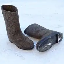 During the 18th and 19th centuries gentlemen's headwear made from beaver felt were popular.[28][33][34] In the early part of the 20th century, cloth felt hats, such as fedoras, trilbies[35] and homburgs,[36] were worn by many men in the western world. Felt is often used in footwear as boot liners, with the Russian valenki being an example.[37][38]