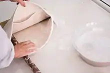In the wet felting process, hot water is applied to layers of animal hairs, while repeated agitation and compression causes the fibers to hook together or weave together into a single piece of fabric.[15][9] Wrapping the properly arranged fiber in a sturdy, textured material, such as a bamboo mat or burlap, will speed up the felting process. The felted material may be finished by fulling.