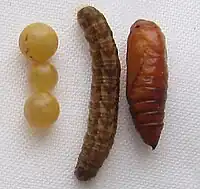 Larval and pupal stage of a Feltia species next to what appears to be osmocote plant fertilizer