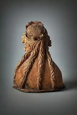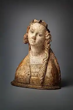 In size and shape, the statue corresponds to the reliquary busts and is believed to have served as their complement on the altar. It is artistically related to another two similar reliquary busts from Dolní Vltavice, purchased in 1934 for the Kunstmuseum Düsseldorf (Stiftung Museum Kunst Palast),[3] and also to the busts of the Parler workshop in the triforium of St. Vitus Cathedral (Wenceslas von Radetz, Anna von Schweidnitz, Elizabeth of Bohemia).[4][5] As the carved pews in the choir of the cathedral (destroyed in a fire in 1541) also came from Parler's workshop, it can be assumed that the author of the bust may have worked there.[6]