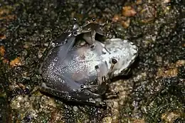 During mating, the femoral glands' placement on the male's ventral surface of the thigh suggests that they may contact the female's dorsal skin, implicating the glands in reproductive signalling.[7] Gland secretions may influence female behaviour, potentially stimulating oviposition and aiding intra-species recognition.[8] The variation of the femoral glands in the species Nyctibatrachus major may reflect hormonal regulation akin to thumb pad elaboration, a common secondary sex characteristic in male frogs. The size and function of femoral glands in N. major show seasonality and a correlation with reproductive activity, paralleling the strict seasonal changes in the Western Ghats environment. The presence of femoral glands in males of this species with small snout–vent lengths indicates that the development of these glands begins at a relatively early stage.[9]