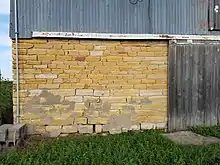 A regional construction material, Fencepost limestone appears yellowish to buff with orange to brown tinted streaking, sometimes weathering to nearly white in color when openly exposed for many decades. Use of this particular limestone bed of for construction slightly preceded the realization that it could be used for fenceposts. First homes for settler farmers on the treeless prairie were typically dugouts and sod houses. Commercial dimensional lumber was an expense ill-afforded by settler farmers, even more so where it had to be shipped in from out-of-state. The Greenhorn Formation has many limestone beds, but most are too thin, too soft, or too fragile to be used in permanent buildings. The Fencepost bed, however, has convenient thickness and is easily worked into tough, durable, and decorative building blocks. Its resistance to erosion compared to the overlying Carlile Shale results in it forming broad bluffs or plateaus; so, it is abundant and relatively easy to quarry. In an age of kerosene lamps and coal stoves, it was a fireproof alternative to scarce timber.[15]