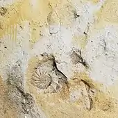 More than any other rock bed in of the lower Colorado Group, the Fencepost makes durable displays of marine fossils of the Cenomanian and Turonian ages; particularly in shiner-laid masonry,[15] fenceposts, landscaping pieces, and flagging. Visible fossils present in the Fencepost limestone bed are the same invertebrate fossils of the Pfeifer Shale member, which also continue into the lower Fairport Chalk member.[17] The presence of these particular index fossils species helps identify the Fencepost bed as distinct from the limestone beds of the Fairport Chalk above and the Jetmore Chalk member below. The most easily spotted fossil is the Inoceramus (Mytiloides) labiatus (Schlotheim), including a broad/flat form subpopulation that appears in the vicinity of the Fencepost. Other common Fencepost fossils include Inoceramus cuvieri Sowerby, Collignoniceras woollgari, Baculites yokoyamai Tokunaga and Shizimu, and Pseudoperna bentonensis (Ostrea congesta var. bentonensis)[50]
