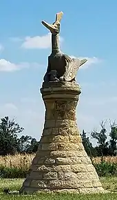 Roughly only a foot thick, fine-grained Fencepost limestone has seen limited use in public sculpture. However, the ability to make large stone slabs has seen the adaptation of the bed to bas-relief. The bas-relief technique permits the artist to manipulate the variations of tone within the slab. Past Victoria sculptor John Linenberger used this technique in a carving on the convent adjoining the St. Fidelis Church, carving through the brown layer to expose the lighter interior stone.[34] Hays sculptor Peter "Fritz" Felten, Jr., used the same technique in plaques mounted in the sloping pedestal of his Monarch of the Plains at the Fort Hays State Historic Site.[35]