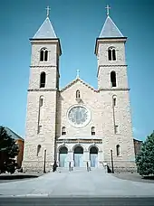 Basilica of St. Fidelis, Victoria (known informally as the "Cathedral of the Plains").[24] Parishioner farmers hauled 17 million pounds (7.7 million kg) of Fencepost limestone in horse-drawn wagons to build it.[25]