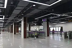 Fengxian Xincheng (simplified Chinese: 奉贤新城; traditional Chinese: 奉賢新城; pinyin: Fèngxián Xīnchéng; lit. 'Fengxian New City') is a station on Line 5 of the Shanghai Metro. Located at Baixiu Road and Jinhai Highway in the city's Fengxian District, the station is located on the main branch of Line 5 and opened as part of the southern extension of Line 5 on 30 December 2018.[1] It is an underground station and will serve as the southern terminus of the line until the future opening of Pingzhuang Highway. During the planning and construction stages, this station was known as Nanqiao Xincheng (南桥新城; 南橋新城; Nánqiáo Xīnchéng; 'Nanqiao New City').[2][3]