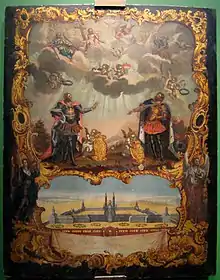 Construction of the southern wing of the monastery building, from the Holy Trinity Cathedral to the southern boundary of the monastery, began in 1725, overseen by Leonard Theodor Schwertfeger.[1] Construction stalled in 1730, and only resumed in 1741 under Pietro Antonio Trezzini.[2] The two-storey wing was finally completed under the auspices of Ivan Rossi in 1748. The south-eastern corner continued the style of the north Dukhovsky wing, and like that wing, was finished with a two-storey church, laid down on 9 August 1745, and intended to be the symmetrical counterpart of the Annunciation Church.[1][3][4] Construction of the church lasted for seven years, with further work to attach a staircase carried out between 1755 and 1761 by M. D. Rastorguev.[1][5] The decoration was completed by 1766.[2] As completed the church building contained two churches, one on the ground floor and one on the upper floor.[3] The icons were painted by Aleksey Antropov.[1] The churches were only consecrated in 1770; the upper one in the name of Holy Prince Feodor of Yaroslav, brother of Saint Alexander Nevsky; and the lower one in the name of Saint John Chrysostom.[1][2][3]